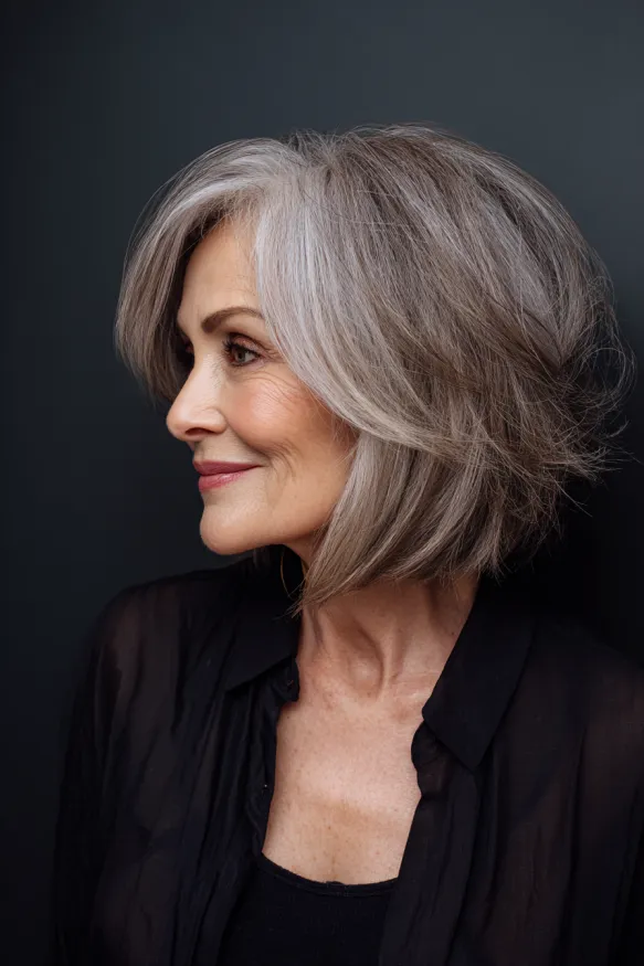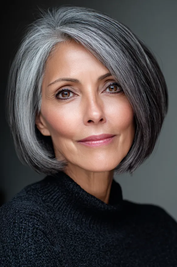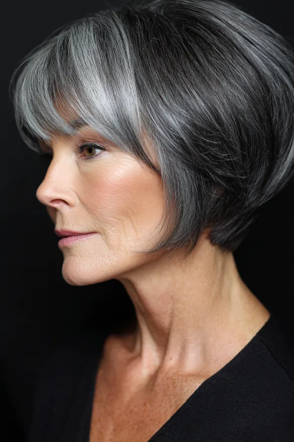 This sharply defined chin-length bob features sleek layers that hug the jawline just right. The deep side part adds drama and draws attention to the eyes, while the natural salt-and-pepper blend creates stunning contrast and dimension. The finish is smooth and glossy, giving the whole style a polished, elegant feel.