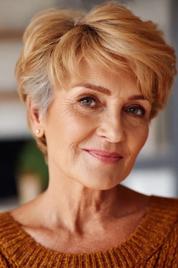 This chic cropped cut features soft layers that taper perfectly around the nape and ears, creating a clean and flattering shape. The top has slightly longer layers styled to the side, giving a boost of volume and texture that feels modern but totally wearable. The warm blonde tones with hints of silver add brightness and dimension without looking too bold.