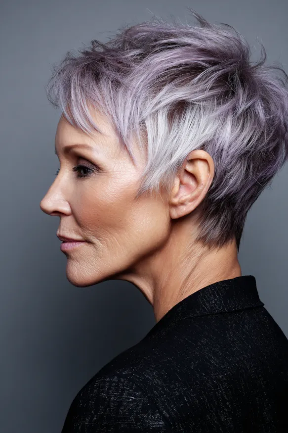 This edgy pixie is packed with personality thanks to its spiky texture and soft lavender tones. The choppy layers are cut short and styled upward and outward, giving tons of lift and dimension. The color transitions from a silvery base to a delicate pastel purple, making the whole look feel modern and playful. Tapered sides keep it neat and flattering around the ears and neckline.