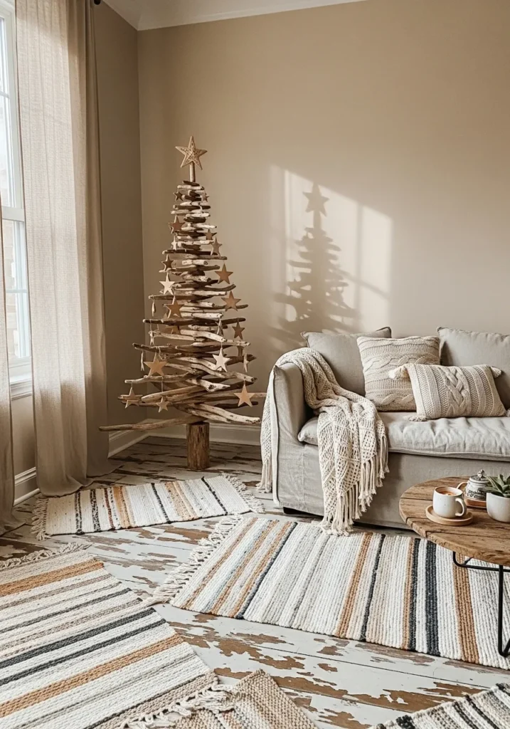 This cozy little nook captures the heart of a boho Christmas with its earthy textures and easygoing charm. The minimalist wooden tree, made entirely from stacked driftwood branches and topped with a carved star, feels so beautifully organic. Soft neutral tones flow through the space, from the oatmeal-colored sofa to the handwoven striped rugs scattered across the distressed floor. Knitted pillows and a tasseled throw add layers of warmth, while the sunlight pouring through sheer curtains makes everything glow softly.