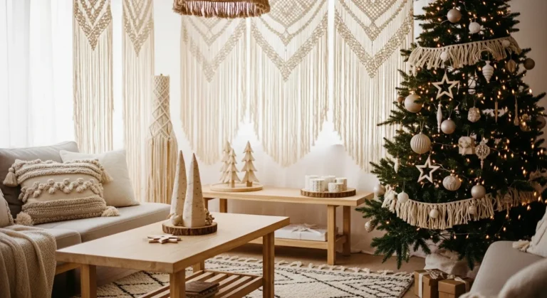 I adore how this space glows with warmth and calm at the same time. The mix of textures makes it feel relaxed but still intentional, like someone poured love into every little corner. The sunlight on the macrame and garlands gives it that “golden hour magic” I can’t get enough of. It’s the kind of living room that makes you want to grab a cozy throw, sip hot cocoa, and just breathe in the calm of Christmas.