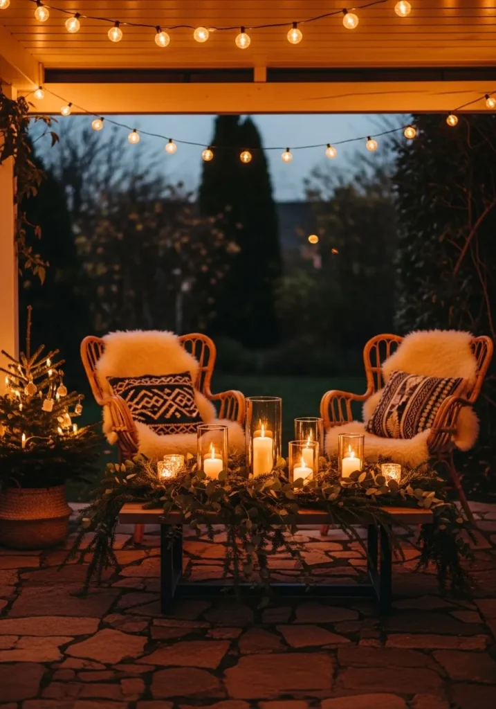 This dreamy outdoor setup feels like a warm hug on a chilly December evening. Two rattan chairs with fluffy faux fur throws and patterned boho pillows create the perfect seating for long chats under twinkling string lights. A low wooden table glows with flickering candles inside glass holders, surrounded by lush greenery that adds that festive, organic touch. The small Christmas tree tucked in a woven basket gives the space a sweet seasonal charm without feeling overdone. It’s simple, warm, and perfectly relaxed.