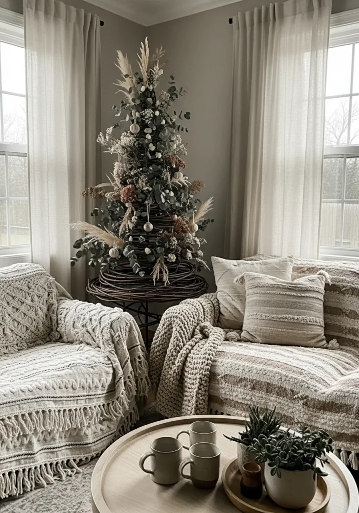 This cozy corner is all about warm neutrals and soft layers that make you want to curl up and stay awhile. The space features creamy knit throws, tasseled blankets, and textured pillows that instantly create that boho-meets-holiday magic. The Christmas tree steals the show with its natural, organic look, dressed in eucalyptus, dried florals, and pampas grass instead of the usual tinsel and glitter. Soft light filters through sheer curtains, wrapping everything in a gentle glow that feels calm and serene.