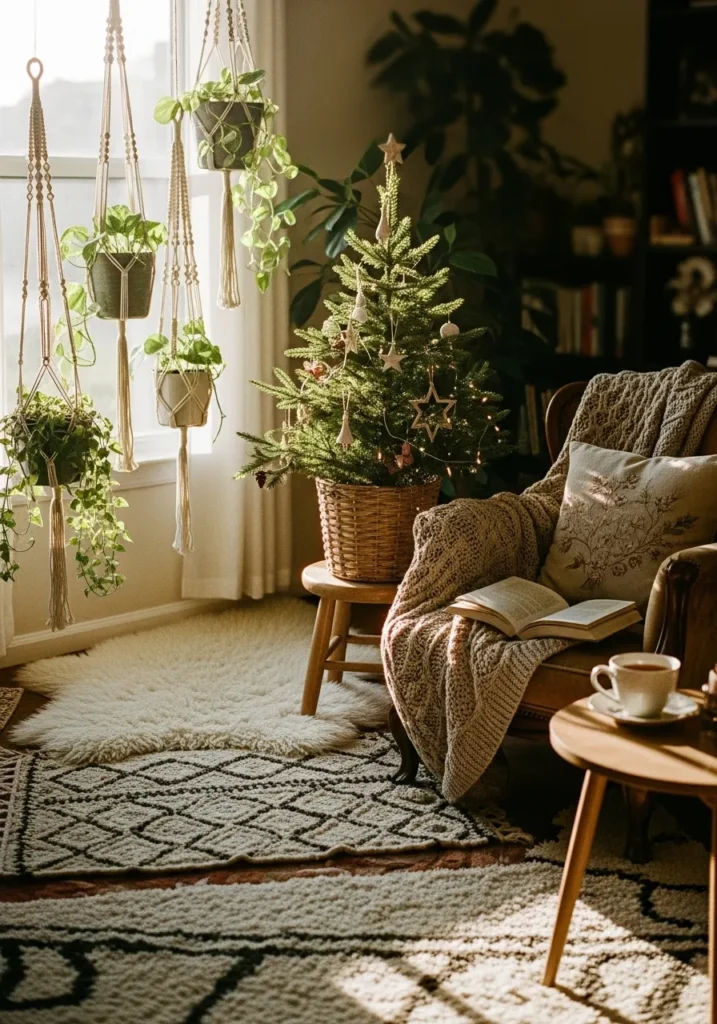 This little corner feels like a warm hug on a chilly December afternoon. A petite Christmas tree, sitting in a woven basket, sparkles softly beside a sunlit window where macramé plant hangers sway gently above. The mix of lush greenery, soft knits, and natural textures brings that laid-back boho spirit to life. A patterned rug layers beautifully over the wooden floor, while the cozy armchair—draped with a chunky blanket and embroidered cushion—just begs you to curl up with a cup of tea and a good book.