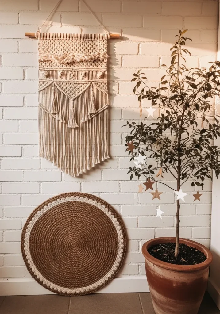 This cozy little nook feels like the perfect example of boho simplicity. The white brick wall gives a soft neutral backdrop that lets every texture shine, from the intricate macramé wall hanging to the woven jute mat below. The small potted tree adds a touch of life, with its delicate paper star ornaments giving just the right amount of festive sparkle. The warm earthy tones and handcrafted details make the whole setup feel organic, personal, and quietly beautiful.