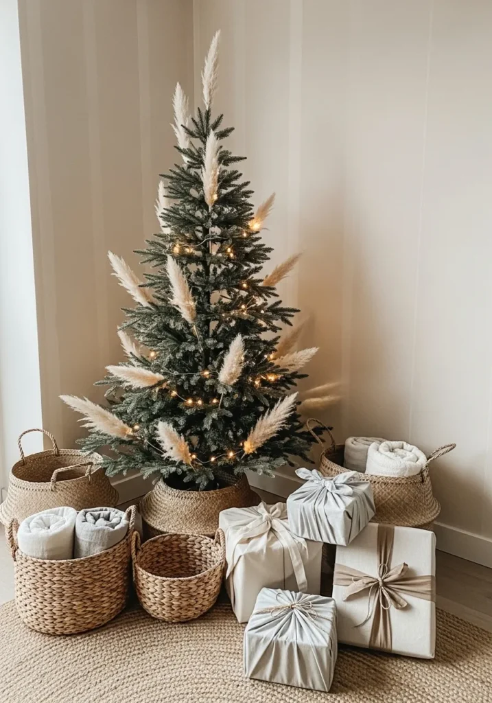 This cozy little setup is what minimalist holiday dreams are made of. A simple pine tree sits gracefully in a woven basket, its branches lightly dressed with pampas grass and soft fairy lights. The natural textures of jute, wicker, and linen add that easygoing boho charm, while the neutral palette of beige and cream keeps everything calm and balanced. Even the gifts are wrapped in fabric and tied with understated ribbons, proving that Christmas magic doesn’t need glitter to sparkle.