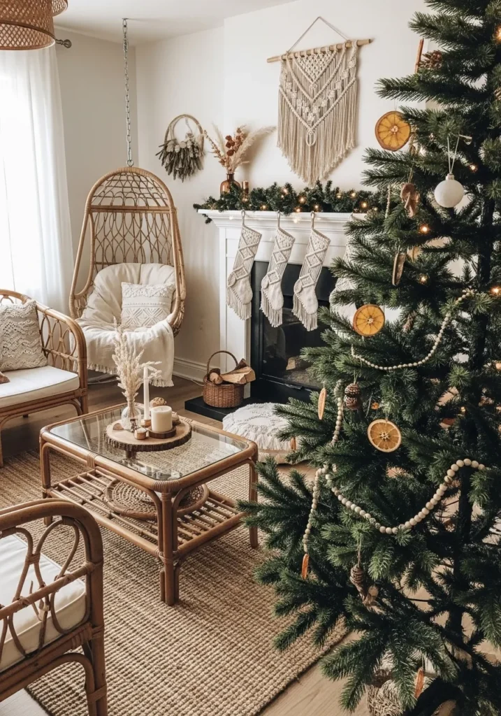 This living room is the picture of cozy boho charm with its warm rattan furniture, woven textures, and a Christmas tree dressed in earthy ornaments. The space feels effortless and grounded, with soft cream cushions, macramé stockings hanging neatly across the mantel, and a simple garland that adds a touch of green without overwhelming the room. The hanging chair and neutral rug bring in that easy, laid-back vibe, while dried orange slices and wooden beads on the tree add just the right amount of natural festivity. Every detail feels like it belongs to a quiet December morning filled with soft light and warm cocoa.