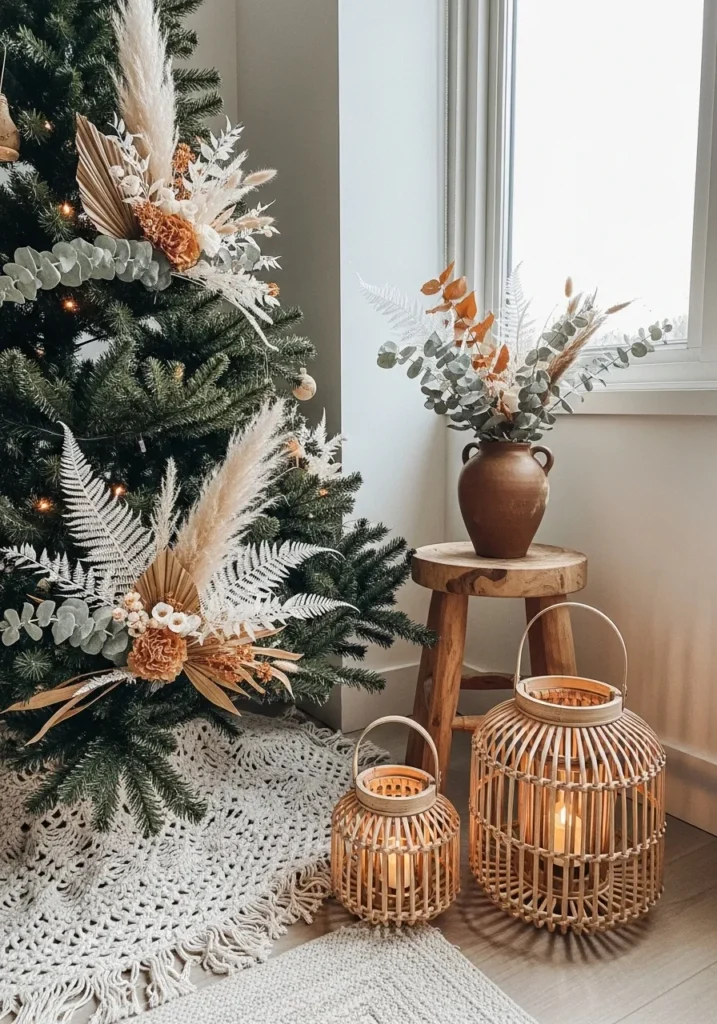 This cozy corner feels like a breath of fresh winter air with its earthy tones and natural textures. The Christmas tree is dressed in dried palm leaves, pampas grass, and soft white ferns instead of traditional ornaments, giving it that relaxed boho charm. A rustic wooden stool holds a clay vase filled with neutral-toned foliage, while woven lanterns cast a soft golden glow across the room. The layered macramé rug ties everything together, creating a warm and inviting nook that feels perfectly imperfect in the best way.