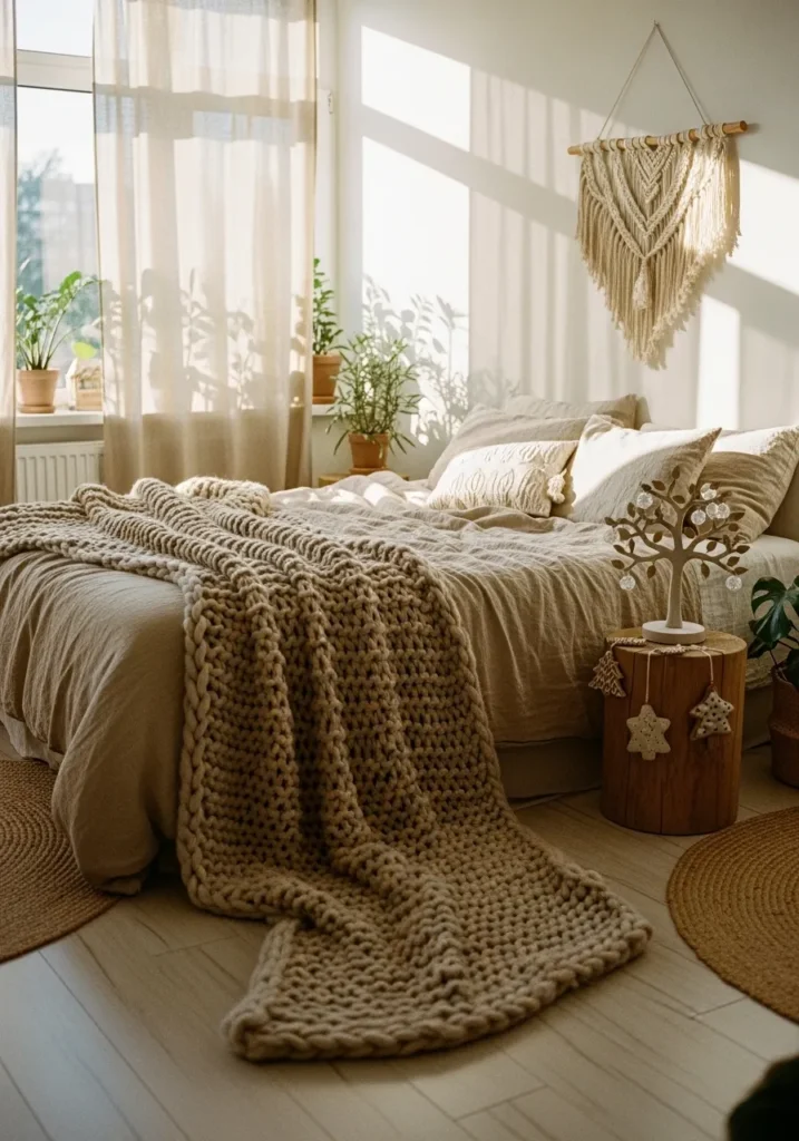 This bedroom captures everything I adore about cozy boho design. The soft sunlight streaming through sheer beige curtains makes the whole space glow, while the mix of natural textures—like the chunky knit throw, linen bedding, and woven rug—adds that effortless warmth. The macramé wall hanging and potted plants bring in earthy charm, and I love how the wooden side table doubles as a little stage for those star-shaped ornaments and the sweet decorative tree. It’s simple, grounded, and quietly festive without going over the top.