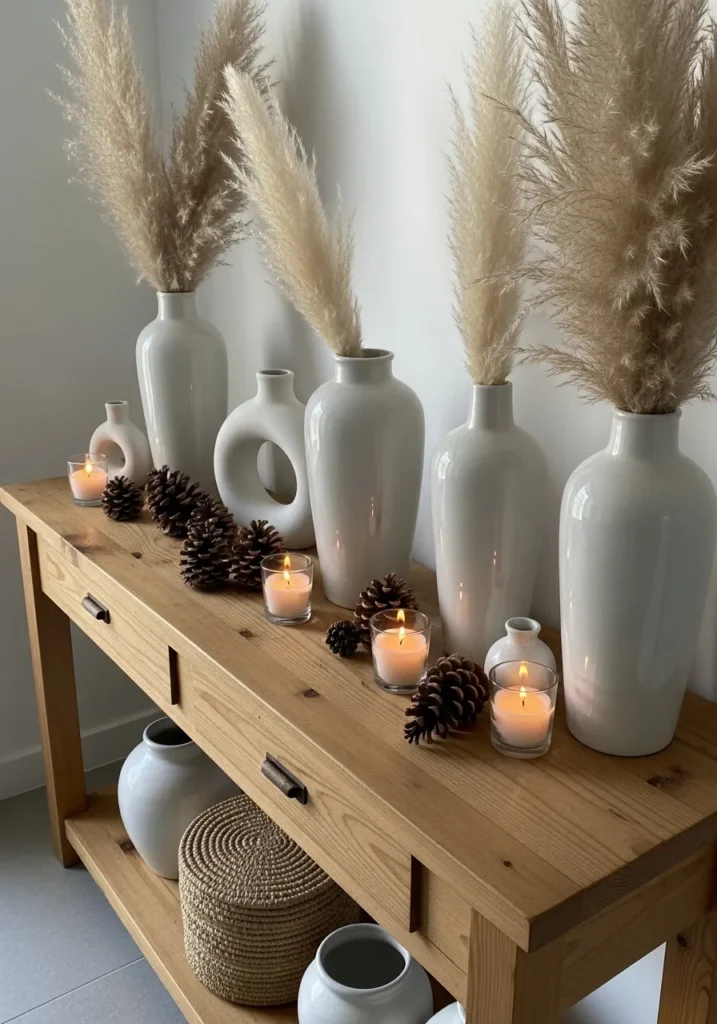 This cozy boho console setup is the perfect blend of minimalism and warmth. A row of tall white ceramic vases filled with feathery pampas grass instantly softens the space, while pinecones and softly flickering candles add a festive touch without feeling overdone. The natural wood console brings in a grounding element that feels organic and relaxed, complemented by woven textures and neutral pottery tucked neatly underneath. Everything feels calm, effortless, and quietly Christmassy.