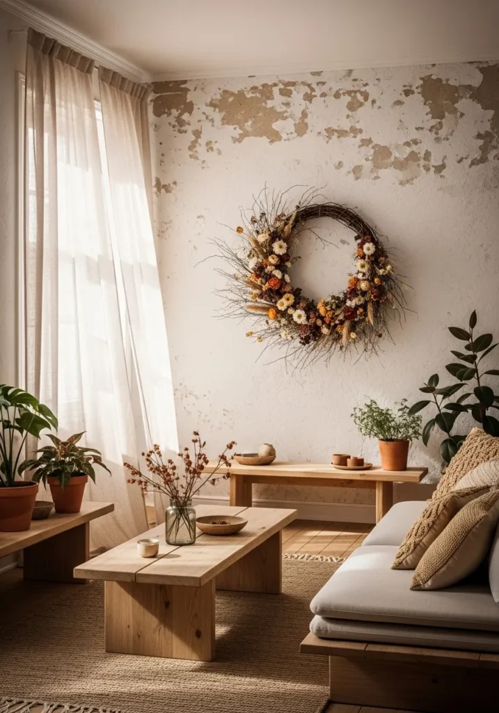 This airy living room feels like a breath of calm Christmas air. The neutral palette of sandy beiges and soft woods pairs beautifully with the rugged texture of the wall, giving off that imperfectly perfect boho charm. A large handmade wreath, crafted from dried twigs and wildflowers in warm tones of gold, cream, and rust, anchors the room as a subtle nod to the season. Sunlight filters through sheer curtains, gently brushing over potted plants, natural wood furniture, and woven textures that add softness without clutter.