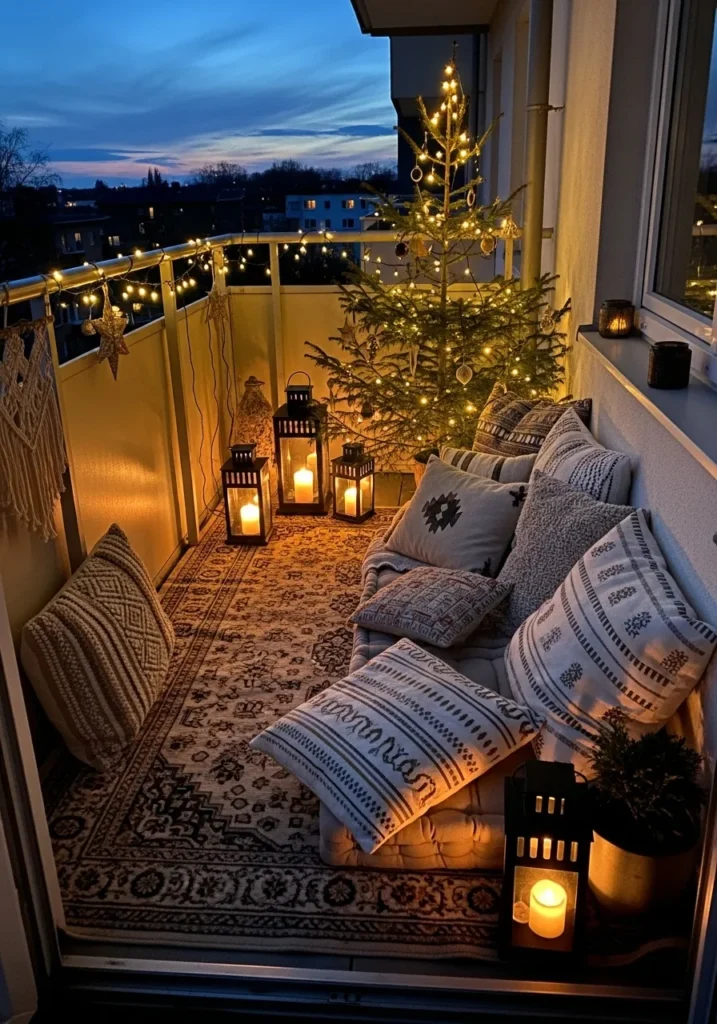 This charming little balcony proves that even the smallest outdoor space can feel like a Christmas retreat. The setup features a lush tree wrapped in warm fairy lights, surrounded by woven lanterns flickering with soft candlelight. Layered textiles steal the show here, with patterned floor cushions, tribal-print pillows, and a vintage-style rug creating the ultimate cozy corner. The golden-hour view adds the perfect dreamy backdrop, while string lights along the railing sprinkle in that touch of festive magic.