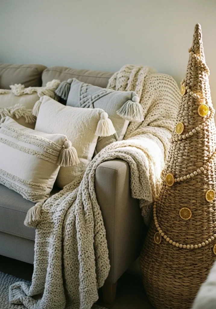 This space captures everything I love about relaxed boho Christmas style. A soft beige sofa is piled high with tasseled pillows and chunky knit blankets, creating a cozy little cocoon you just want to melt into. The natural textures keep everything feeling grounded, from the thick yarn to the woven rattan tree wrapped in wooden beads and dried orange slices. The muted palette of creams and soft taupes makes it peaceful yet still festive in a quietly charming way.