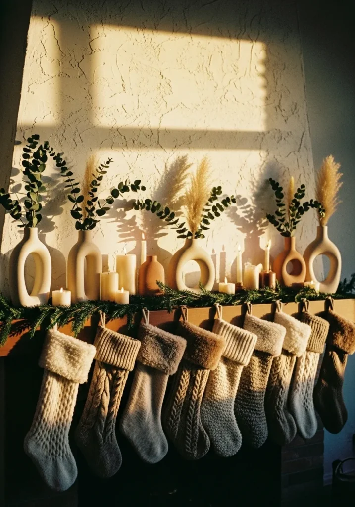 This mantel design feels like a cozy winter morning bathed in golden sunlight. A row of knitted and faux fur stockings in soft neutral tones hangs perfectly below a rustic wooden shelf. Above it, sculptural ceramic vases in creamy whites and soft beige hold sprigs of eucalyptus and pampas grass, surrounded by an assortment of ivory candles and evergreen garland. The texture play here is stunning—smooth ceramics, fluffy knits, and the gentle shimmer of candlelight all come together to create a calm, organic feel that still feels festive.
