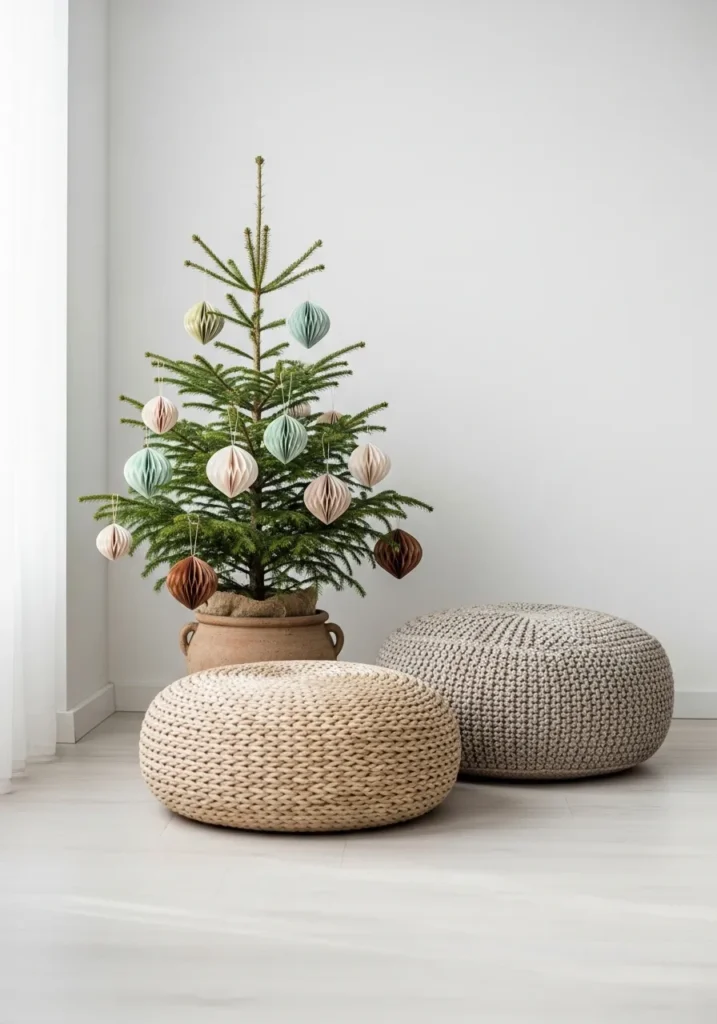This cozy little corner shows how simplicity can feel completely magical. A small pine tree sits neatly in a rustic clay pot, dressed in soft paper ornaments in earthy pastels and muted tones of mint, blush, and caramel. The natural textures continue with two round poufs in woven and knitted finishes, creating a relaxed and tactile contrast against the clean white walls and light wood floor. Everything about this space whispers calm and balance, perfect for those who love a soft, nature-inspired Christmas vibe.