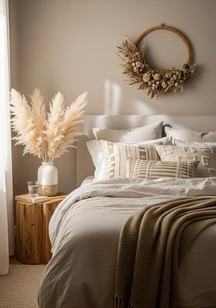 This cozy bedroom is the definition of calm and comfort. The neutral palette of beige, cream, and warm wood tones creates such a soft, soothing atmosphere. Layered linen bedding, textured throw pillows, and that chunky knit blanket make the bed look like a cloud you’d never want to leave. The pampas grass arrangement in a minimalist vase adds height and a natural boho flair, while the dried floral wreath above the bed gives the space an earthy, handcrafted touch. Every detail feels intentional but still effortlessly relaxed.