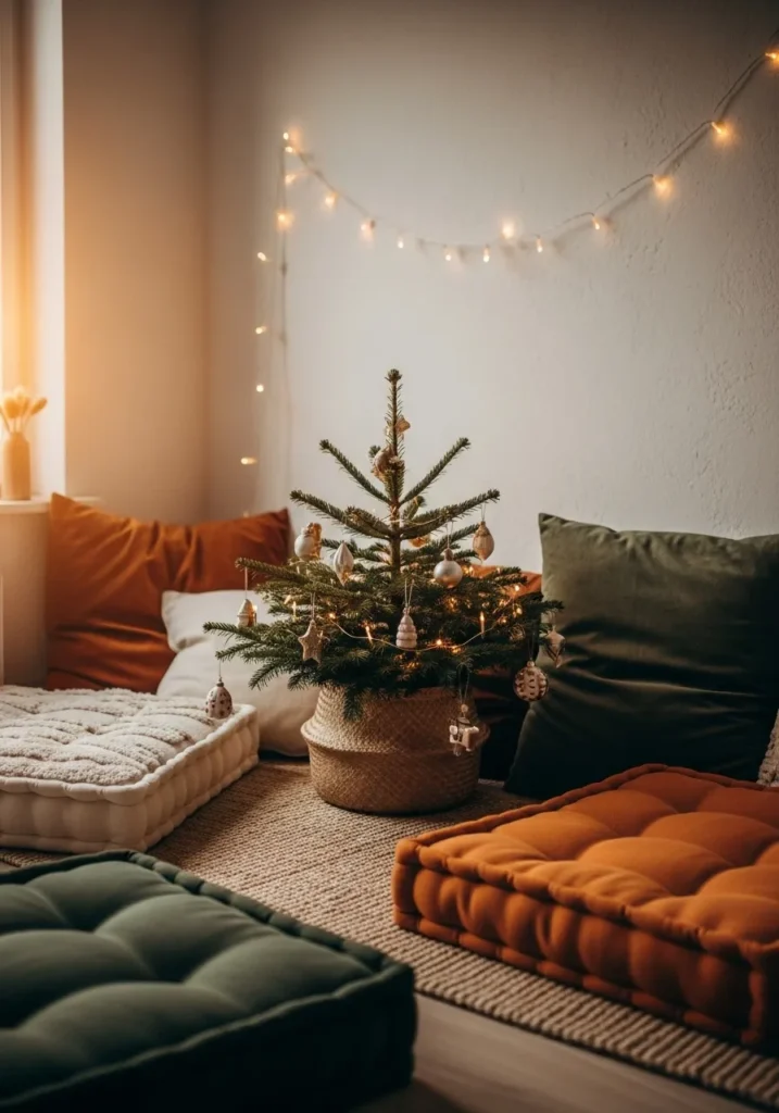 This charming nook feels like the coziest little Christmas hideaway. A petite evergreen tree sits snugly in a woven basket, dressed in warm white fairy lights and tiny neutral ornaments that add just the right touch of sparkle without feeling overdone. The earthy floor cushions in deep green, burnt orange, and creamy beige invite you to sink in and stay awhile, while the soft twinkle lights across the wall make the space glow with warmth. Everything about this setup whispers simplicity, texture, and that effortless boho comfort we all crave around the holidays.