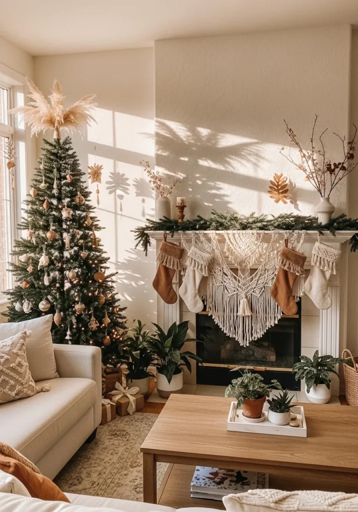 This cozy boho Christmas living room feels like it’s been kissed by the afternoon sun. The soft golden light filters through sheer curtains, dancing over natural textures and earthy tones. A Christmas tree trimmed with neutral ornaments and topped with feathery pampas grass steals the show, while the mantel is layered with evergreens, macrame, and tasseled stockings in warm caramel and cream. Potted plants add fresh greenery that blends beautifully with the tree’s natural vibe, and the woven details everywhere—from the throw pillows to the stockings—make the space feel soft, organic, and effortlessly inviting.