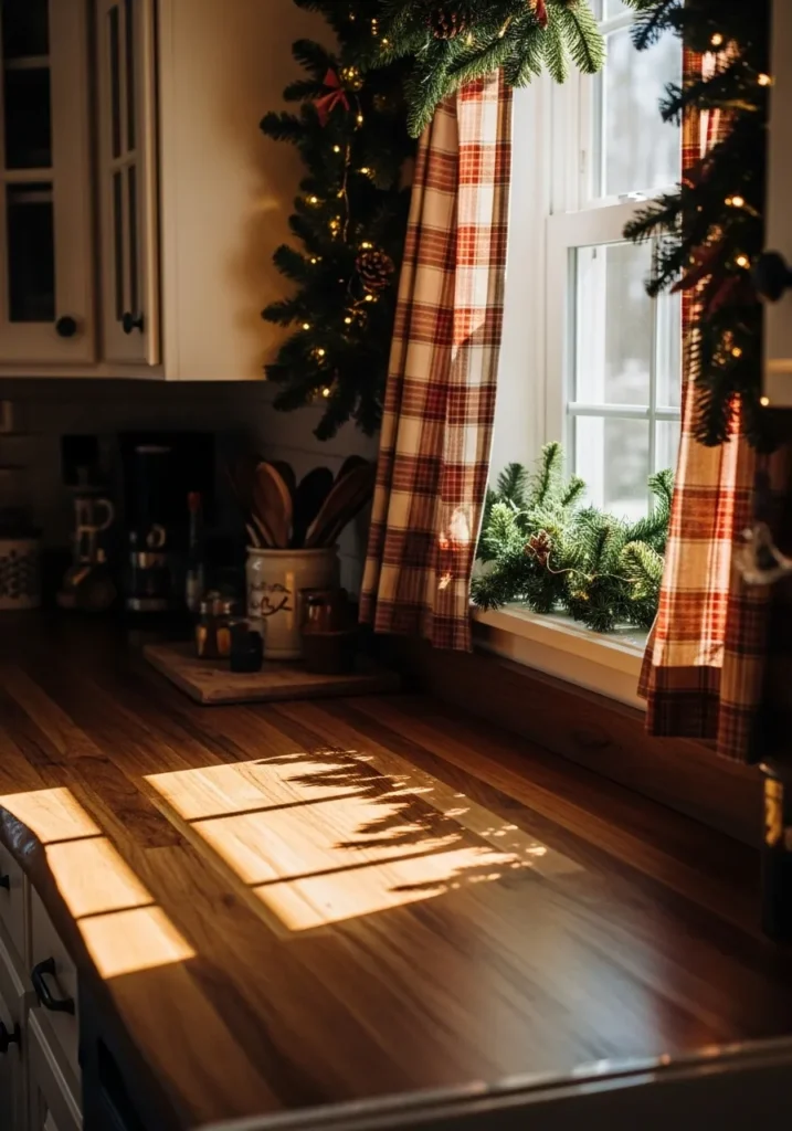 This kitchen feels like the very definition of cozy Christmas charm. The sunlight spills across the wooden countertop, highlighting the soft red plaid curtains and the garland draped lovingly around the window. The little details make it feel extra homey—the pine sprigs with tiny cones, a few fairy lights twinkling quietly, and that jar of wooden utensils waiting for a holiday recipe moment. It’s rustic, warm, and full of that golden morning light that makes you want to stay in your pajamas just a little longer.