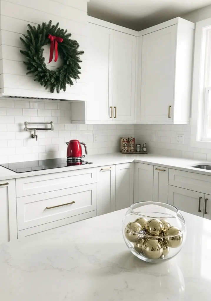 This kitchen is a perfect example of how less can absolutely be more. The crisp white cabinets, marble-style countertops, and sleek gold hardware create such an effortlessly chic backdrop. Then come the little festive details that make it feel warm and merry without overdoing it—the lush green wreath with a red ribbon above the stove, a shiny red kettle that pops against the white, and a clear glass bowl filled with gold ornaments catching the light just right. It’s simple, modern, and oh-so-stylish, like a Pinterest dream come true.