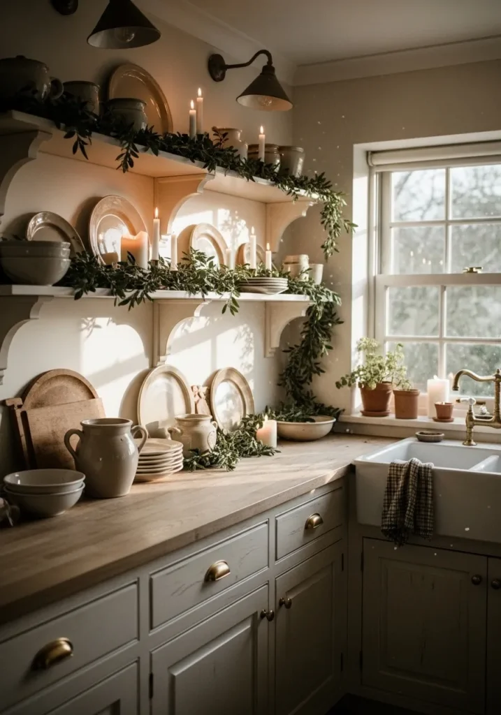 This kitchen feels like a cozy countryside hug with its creamy cabinets, brass hardware, and beautiful wooden countertop. The open shelves are dressed with garlands of fresh greenery that gently frame a collection of rustic ceramics and vintage plates. Soft candlelight flickers across the space, creating that magical golden glow that only candle flames can give. The farmhouse sink by the window and the terracotta pots filled with herbs make it feel warm, lived-in, and just a little bit romantic.