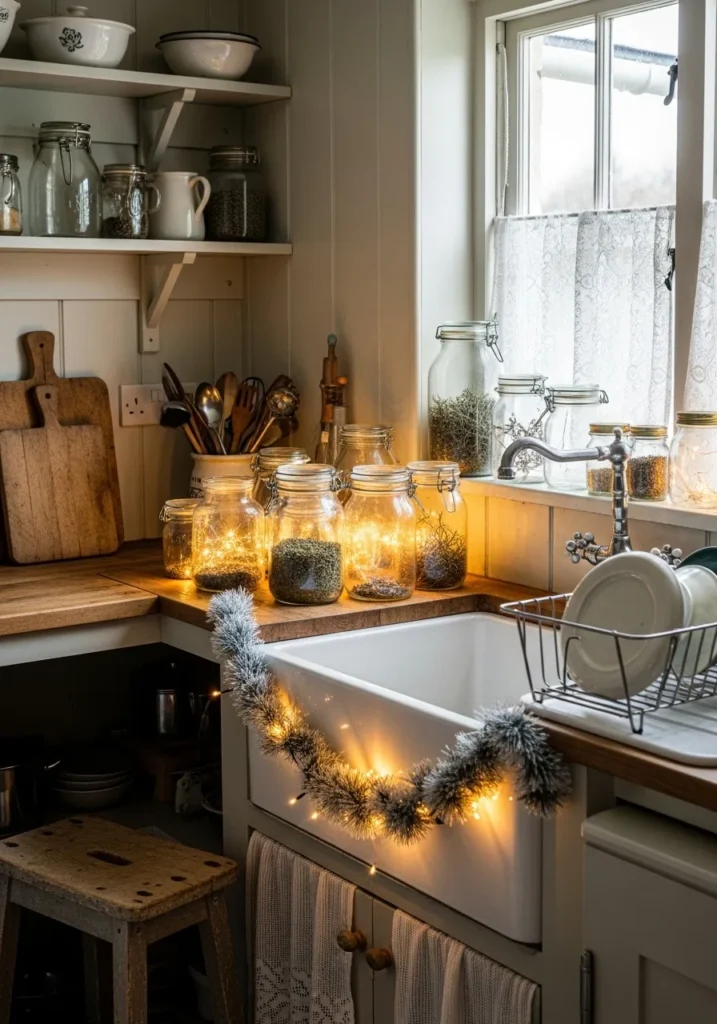 This kitchen feels like stepping into a countryside Christmas postcard. The farmhouse sink, rustic wooden stool, and open shelving filled with jars create such a warm, nostalgic mood. Glass jars line the countertop, some filled with dried herbs and others twinkling with fairy lights, turning everyday storage into magical little lanterns. A frosted garland draped across the sink adds just the right touch of wintry charm, while soft light filters through lace curtains, making everything glow gently.