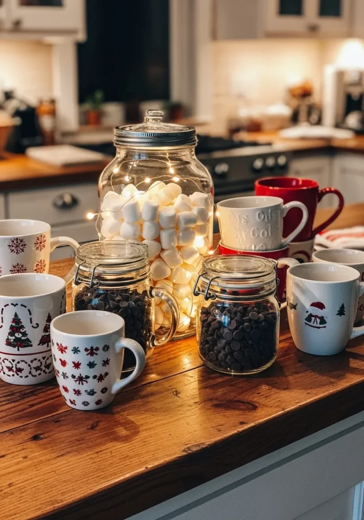 This kitchen setup captures the sweetest part of the holidays with a rustic wooden counter styled as a cheerful hot cocoa station. A big glass jar filled with fluffy marshmallows glows softly under fairy lights, surrounded by clear jars of chocolate chips and a charming mix of Christmas mugs in red, white, and snowflake prints. The warm kitchen lighting adds a soft golden hue, making everything look extra inviting and ready for cozy evenings at home.