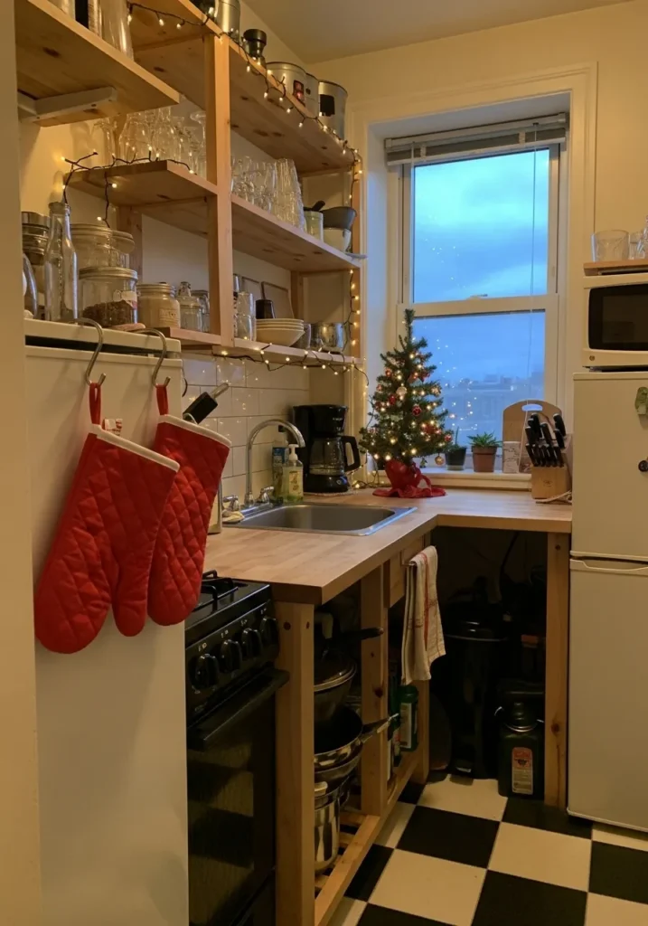 This little kitchen proves that holiday magic doesn’t need a mansion. With warm wooden shelves stacked neatly with glass jars and mugs, fairy lights strung across the walls, and a mini Christmas tree glowing softly by the window, every inch feels cozy and full of personality. The red oven mitts add that perfect pop of festive color, and the checkered floor gives it a playful retro touch that feels straight out of a holiday movie.