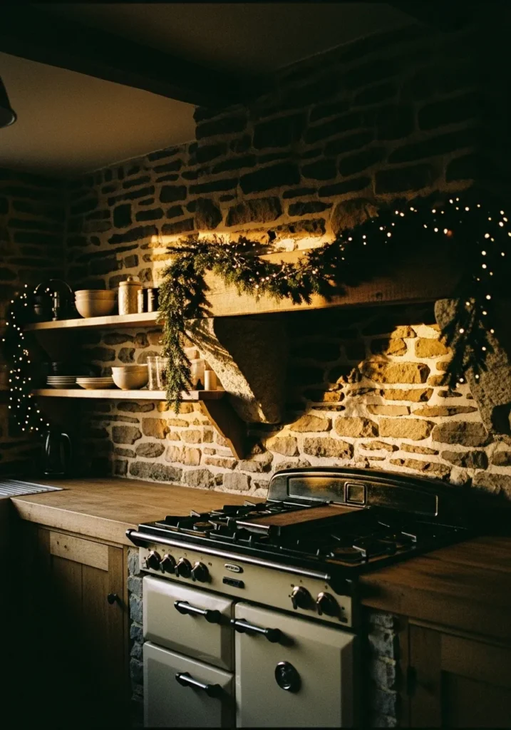 This kitchen feels like it was made for cozy winter evenings. The rough stone walls and warm wooden counters give it that perfect countryside charm, while the classic cream stove ties everything together with vintage elegance. A strand of evergreen garland draped across the wooden beam, sprinkled with tiny fairy lights, adds just the right touch of Christmas sparkle without feeling overdone. The soft golden light bouncing off the stones makes the whole space feel like it’s glowing from within.