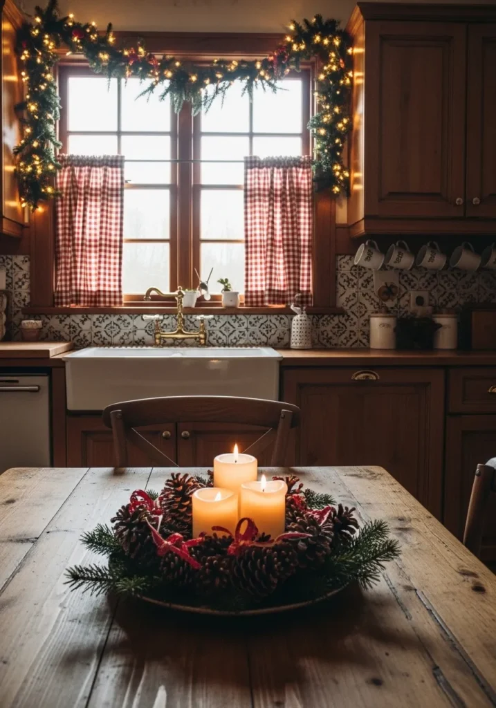 This kitchen feels like the heart of Christmas itself with its cozy, rustic charm. The warm wooden cabinets frame a classic farmhouse sink, while red gingham curtains bring in that perfect touch of nostalgic cheer. A garland wrapped in twinkling lights drapes softly above the window, filling the space with golden warmth. On the table, a simple yet stunning centerpiece made of pinecones, evergreen sprigs, and glowing candles completes the look—proof that sometimes less really is more.