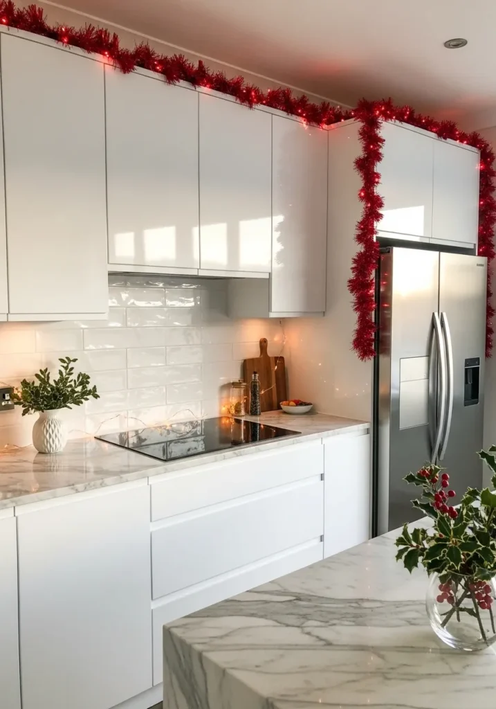 This kitchen feels like a breath of winter air with its crisp white cabinets, glossy subway tiles, and smooth marble countertops. The entire space gleams under soft lighting that bounces off the polished surfaces, while a strand of bold red tinsel with tiny lights runs along the upper cabinets for that instant festive spark. A few sprigs of holly and a simple vase of greenery bring just the right touch of nature, keeping things elegant yet joyful.