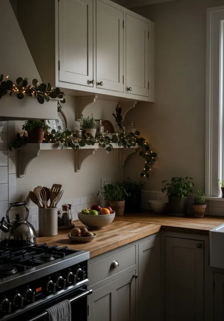 This cozy kitchen feels like it was made for December mornings. The soft neutral cabinets pair beautifully with the warm wooden countertops, creating a naturally inviting space. A garland of fresh greenery intertwined with fairy lights brings just the right amount of sparkle without feeling overdone. Little potted herbs and a bowl of fresh fruit add that lived-in touch that makes everything feel homey and effortless. The whole space has this calm, rustic warmth that makes you want to bake something sweet and linger a little longer by the window.