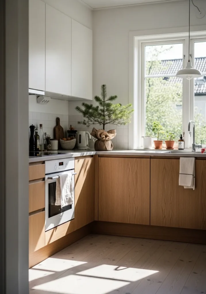 This kitchen is the perfect example of how a little can go a long way when it comes to Christmas decorating. The clean Scandinavian layout features warm wooden cabinets, crisp white walls, and a generous splash of natural light pouring through the window. A small pine tree wrapped in burlap adds just the right amount of seasonal charm, while terracotta pots and simple kitchen essentials keep the space grounded and cozy. It feels like the kind of place where cinnamon rolls are cooling on the counter and soft carols hum from the background.