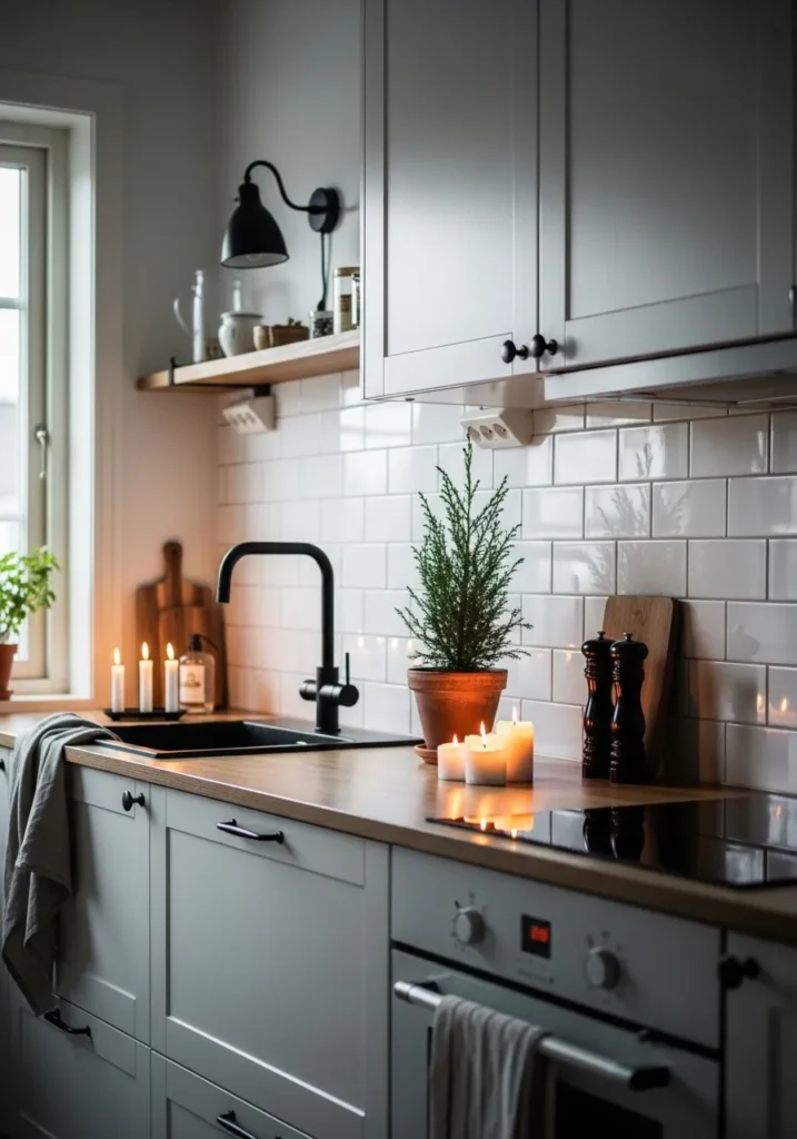 This kitchen feels like a cozy December morning wrapped in soft light and calm charm. The clean white subway tiles, simple shaker cabinets, and black matte faucet create that beloved Scandinavian balance of function and beauty. A few touches instantly bring Christmas spirit to life—tiny evergreens in clay pots, clusters of white candles glowing gently on the wooden counter, and a hint of greenery by the window. It’s proof that even the simplest spaces can feel magical with just a few intentional details.
