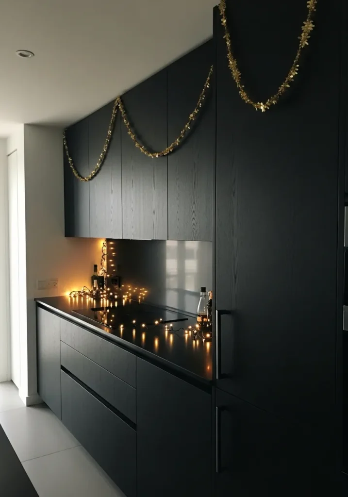 This sleek black kitchen proves that Christmas magic doesn’t always have to come in red and green. The matte cabinetry and glossy backsplash create a luxurious modern backdrop for the soft sparkle of golden fairy lights and a delicate garland draped across the top. The warm light reflecting off the dark surfaces feels like candlelight against velvet, giving the whole space an elegant and cozy glow that’s perfect for a quiet winter evening.