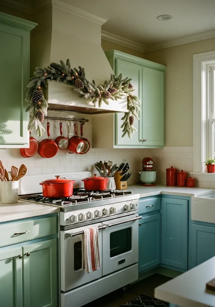 This kitchen is giving serious vintage charm with its mint and turquoise cabinets, snowy pine garland over the range hood, and pops of cherry-red cookware stealing the show. The balance of cool pastel tones with the warm, festive reds makes everything feel so homey and cheerful. I love how the white subway tile backsplash and classic farmhouse sink keep it fresh and timeless, while the little red accents tie it all together with a Christmassy glow.