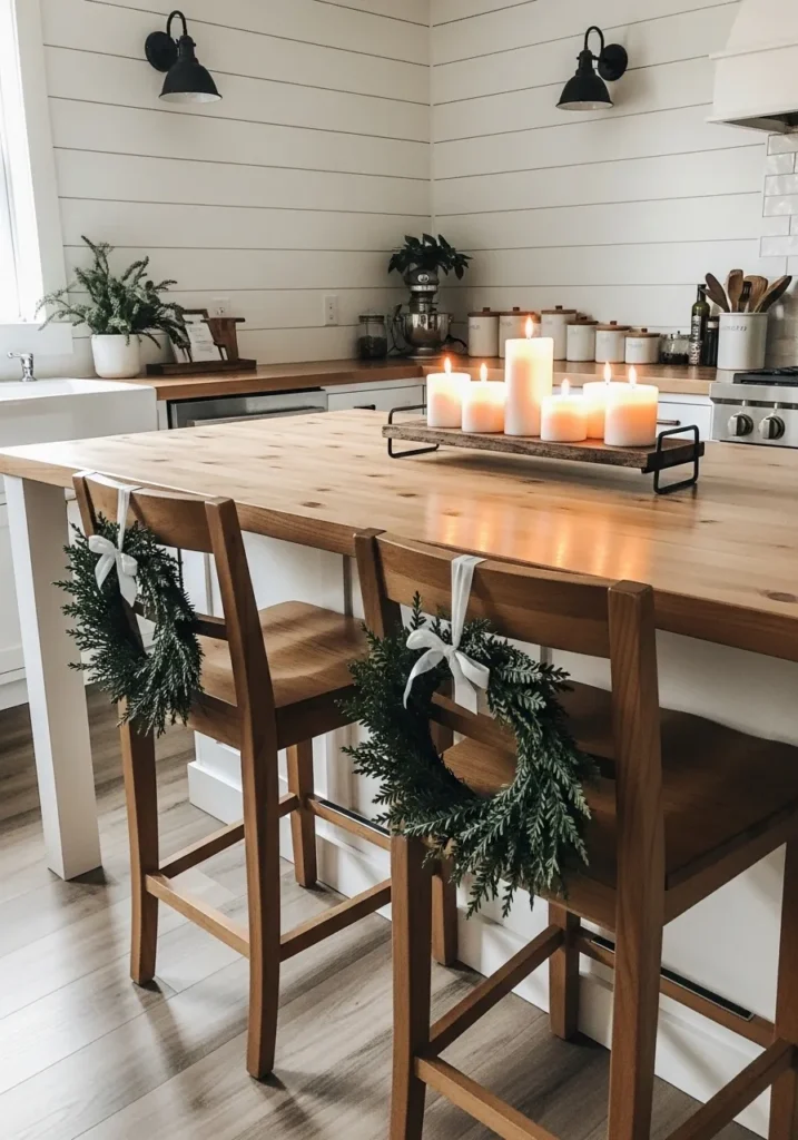 This kitchen captures that dreamy mix of simplicity and warmth that farmhouse lovers can’t resist. The space is wrapped in white shiplap walls and softened with warm wood accents that instantly make it feel like home. A row of glowing candles creates a cozy centerpiece on the island, while small evergreen wreaths tied with white ribbons on the chairs add just the right touch of Christmas cheer. Everything feels clean, calm, and beautifully balanced—like a winter morning that never feels rushed.