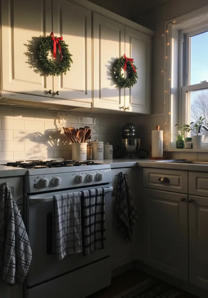 This kitchen feels like pure comfort in the early hours of winter. Soft golden sunlight spills through the window, warming the crisp white cabinets and subway tiles. Simple wreaths tied with red ribbons add a sweet festive touch without overwhelming the space, while twinkle lights frame the window with a gentle glow. The checkered tea towels, wooden utensils, and neatly arranged canisters make everything feel effortlessly homely and perfectly lived-in.