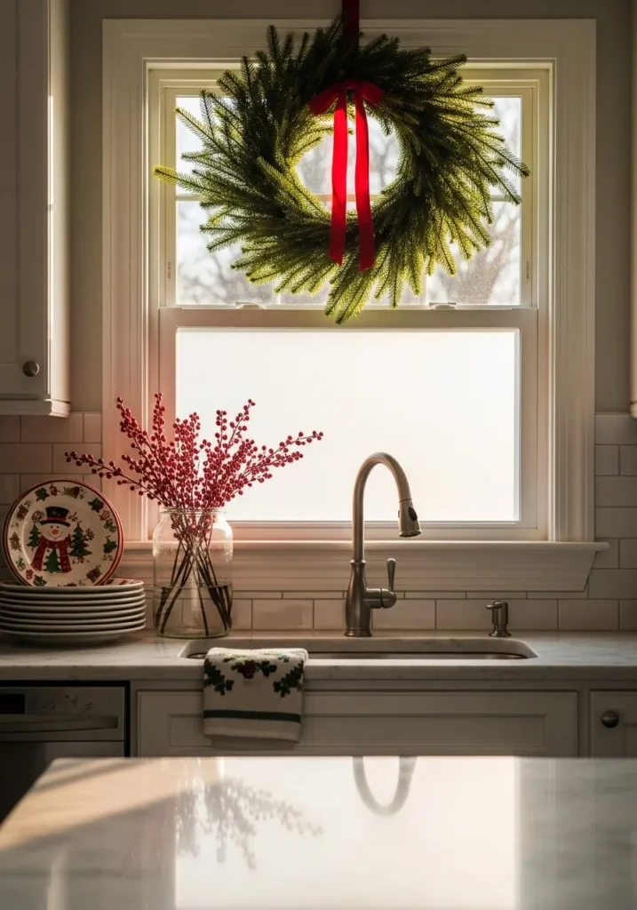 This kitchen feels like a gentle nod to Christmas nostalgia in the most effortless way. A lush green wreath with a bold red ribbon takes center stage above the sink, glowing softly in the afternoon light. Below it, a clear glass jar holds sprigs of red berries that match the cheerful holiday plates stacked neatly beside it. The clean white subway tiles and marble countertop make the space look crisp and bright, giving all the cozy festive touches a perfect stage to shine.
