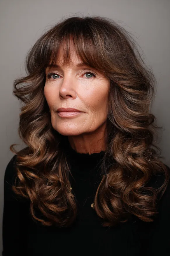 This style brings major glam with its long, voluminous curls that fall in smooth, polished waves. The full fringe skims just above the eyes, adding a romantic touch that blends right into the sides. The chestnut brown color is enriched with caramel highlights, giving the curls extra shine and warmth without overpowering the shape.