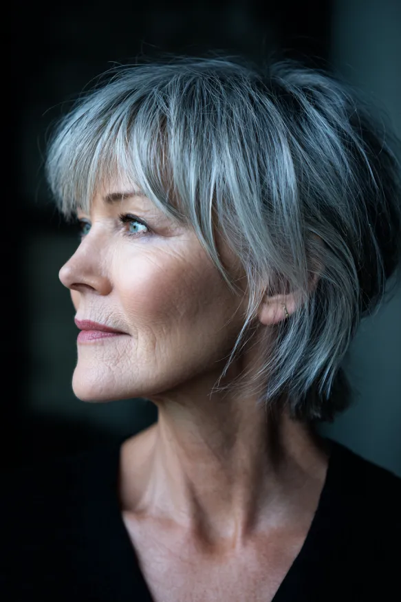 This chic cut features shorter layers around the crown that add volume without bulk, while the sides taper down softly for a flattering silhouette. The wispy bangs fall gently across the forehead, bringing focus to the eyes. Cool silver tones with natural lowlights give the style depth and a touch of shine that brightens the whole look.