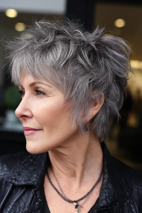 This bold pixie is all about texture and personality. The layers are cut choppy and short, creating spiky dimension that stands out in the best way. The silvery gray tone keeps it modern and cool, while the slightly tousled finish gives it a carefree, confident vibe. Bangs are blended seamlessly into the texture, adding softness right up front.
