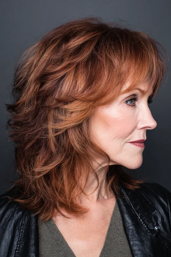 This medium-length shag features bold layers that flip out naturally, giving it a full, lively shape with lots of movement. The bangs fall softly across the forehead and blend into the face-framing pieces, adding a flattering touch without feeling too heavy. The warm auburn color with subtle copper highlights makes the texture pop and adds instant glow.