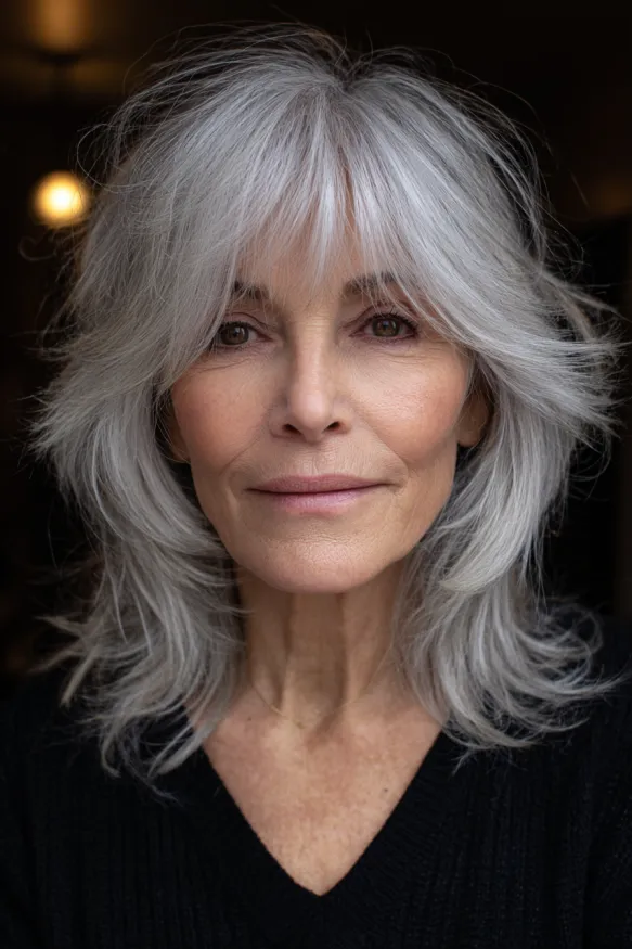 This feathered shag has layers for days, giving it that effortless texture that moves naturally with every turn of the head. The ends are softly flipped out, and those light bangs skim the eyebrows in the prettiest way. The silvery white color gives the whole style a breezy glow that feels fresh and youthful.