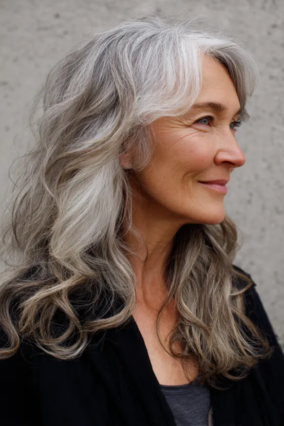 This style features long, softly cascading layers that show off a stunning mix of gray and silver tones. The waves are loose and airy, with just enough bend to feel relaxed but intentional. A side-swept fringe gently blends into the longer front pieces, giving the whole look a natural softness that frames the face beautifully.