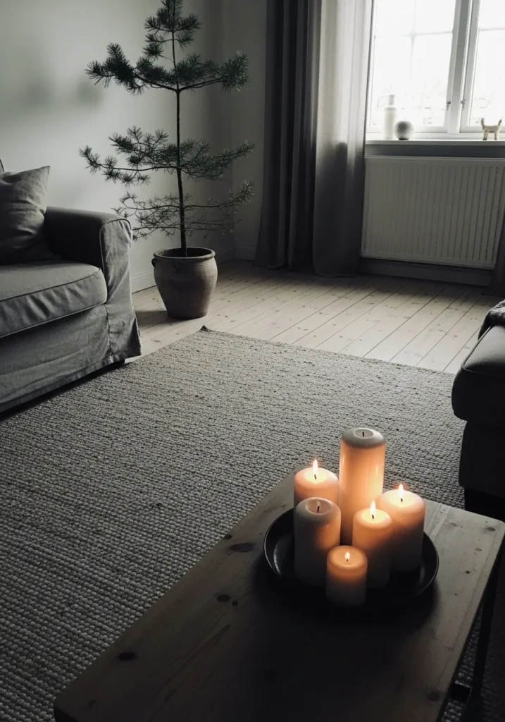 This cozy corner captures the essence of a Scandinavian Christmas with its soft neutral tones and minimal approach. A single potted evergreen stands gracefully by the window, while a handful of pillar candles cast a warm, flickering glow across the muted room. The gray sofa, textured rug, and light wooden floorboards come together in a quiet harmony that feels both timeless and grounding. Every detail whispers comfort without trying too hard, proving that holiday charm doesn’t need to shout to be felt.