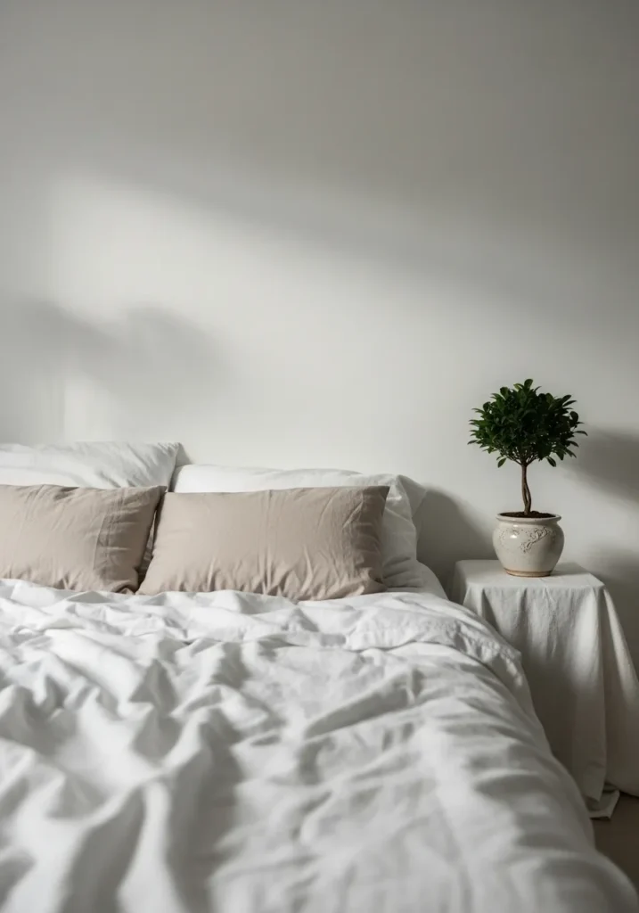 This bedroom design captures everything I love about understated elegance. Crisp white bedding spills softly over the edges, while taupe pillows bring the perfect hint of warmth against the calm backdrop. The side table, draped in linen, holds a petite potted tree that adds a fresh, organic feel to the scene. The natural light washing over the neutral tones makes the entire space look soothing and unpretentious—exactly how a serene Christmas morning should feel.