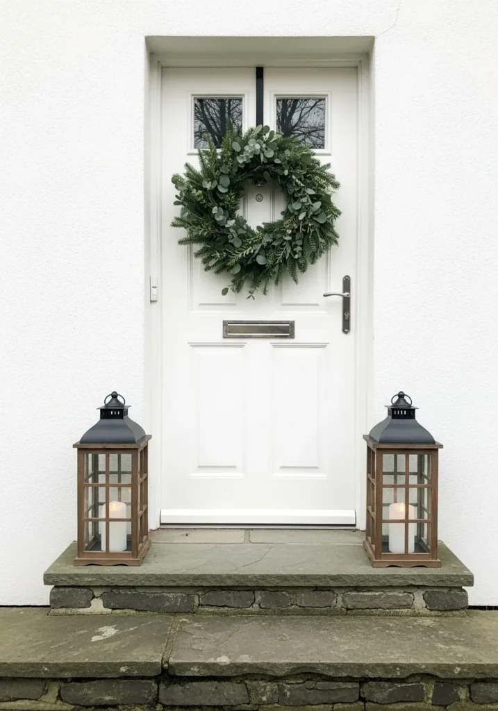 This front entry captures the kind of understated Christmas charm that feels both timeless and modern. A fresh green wreath with soft eucalyptus and pine rests perfectly against the crisp white door, while two large lanterns holding flickering candles frame the steps like a cozy welcome. The muted tones of the stone steps and the warm wood lanterns keep everything feeling balanced and natural, proving that neutral décor can still feel wonderfully festive.