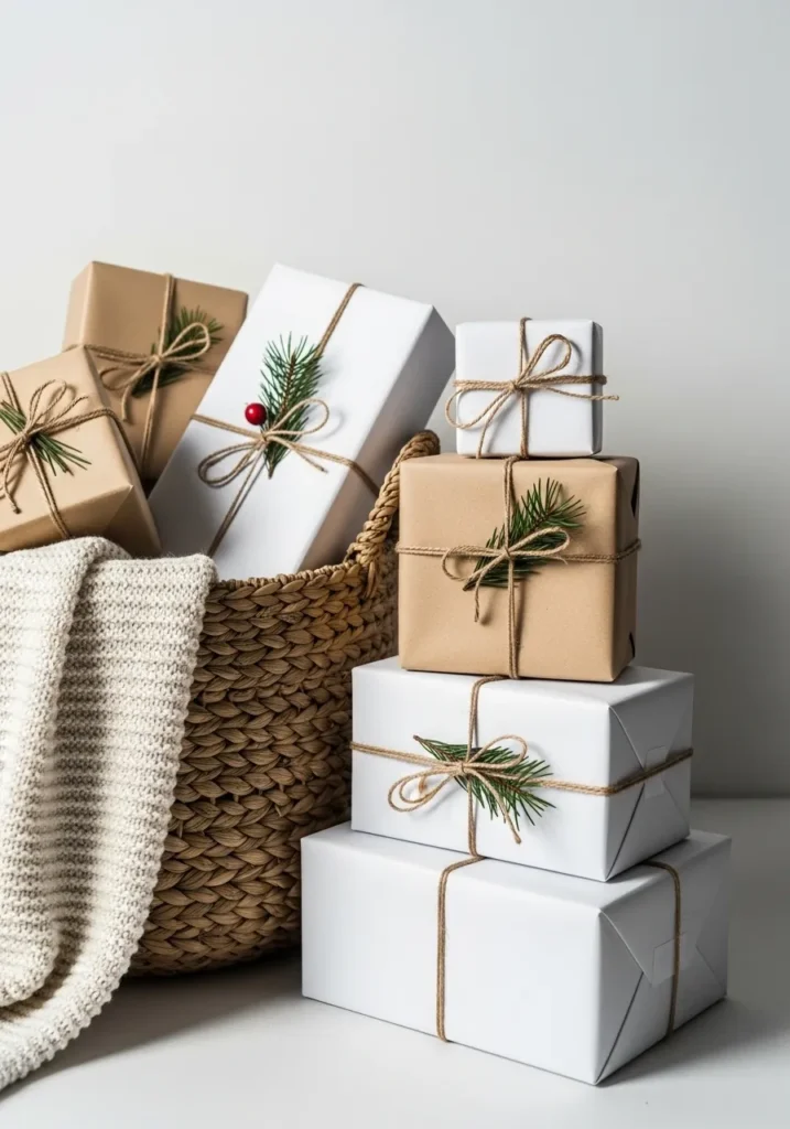 This setup shows how simple wrapping can feel completely luxurious. The gifts are dressed in white and kraft paper, tied neatly with twine, and finished with tiny sprigs of pine for a fresh, organic feel. Nestled beside a chunky knit blanket and a woven basket, the scene gives off that cozy Scandi Christmas vibe that’s equal parts modern and heartwarming. The neutral tones keep things calm and effortless, while the mix of textures—paper, greenery, and soft knits—adds just the right amount of visual interest.