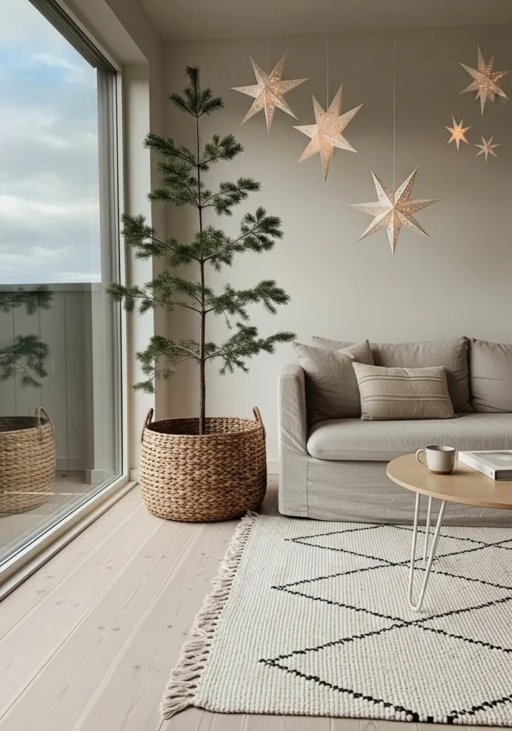 This airy living space captures everything that’s beautiful about Scandinavian design at Christmas. The neutral palette of soft beige and cream creates an instant sense of calm, while the textured rug and woven basket add warmth and coziness. A slender evergreen tree, set neatly in the natural basket, gives a nod to the season without overwhelming the room. Hanging paper star lanterns float gracefully overhead, casting a soft golden glow that feels both festive and peaceful. The light wood tones and simple lines make the space feel open, bright, and effortlessly elegant.